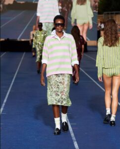 Por fim, Sinéad O’Dwyer buscou modernizar a peça e trazer a tendência do tenninscore já muito vista no streetwear de 2024 para 2025, através de detalhes minimalistas em tricô, como a gola confeccionada nesse material.